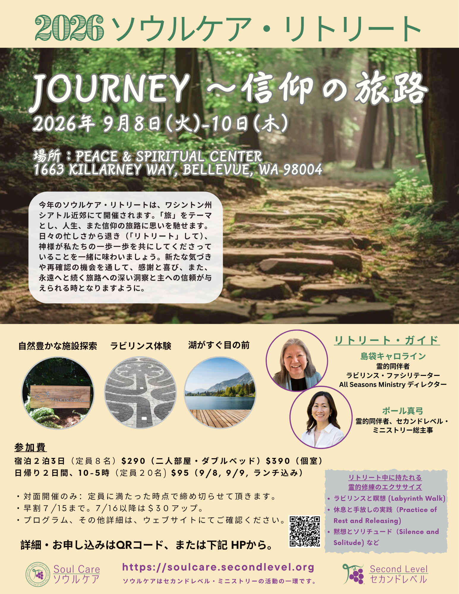 今年のソウルケア・リトリートは、ワシントン州シアトル近郊にて開催されます。「旅」をテーマとし、人生、また信仰の旅路に思いを馳せます。日々の忙しさから退き(「リトリート」して)、 神様が私たちの一歩一歩を共にしてくださって いることを一緒に味わいましょう。新たな気づきや再確認の機会を通して、感謝と喜び、また、 永遠へと続く旅路への深い洞察と主への信頼が与えられる時となりますように。